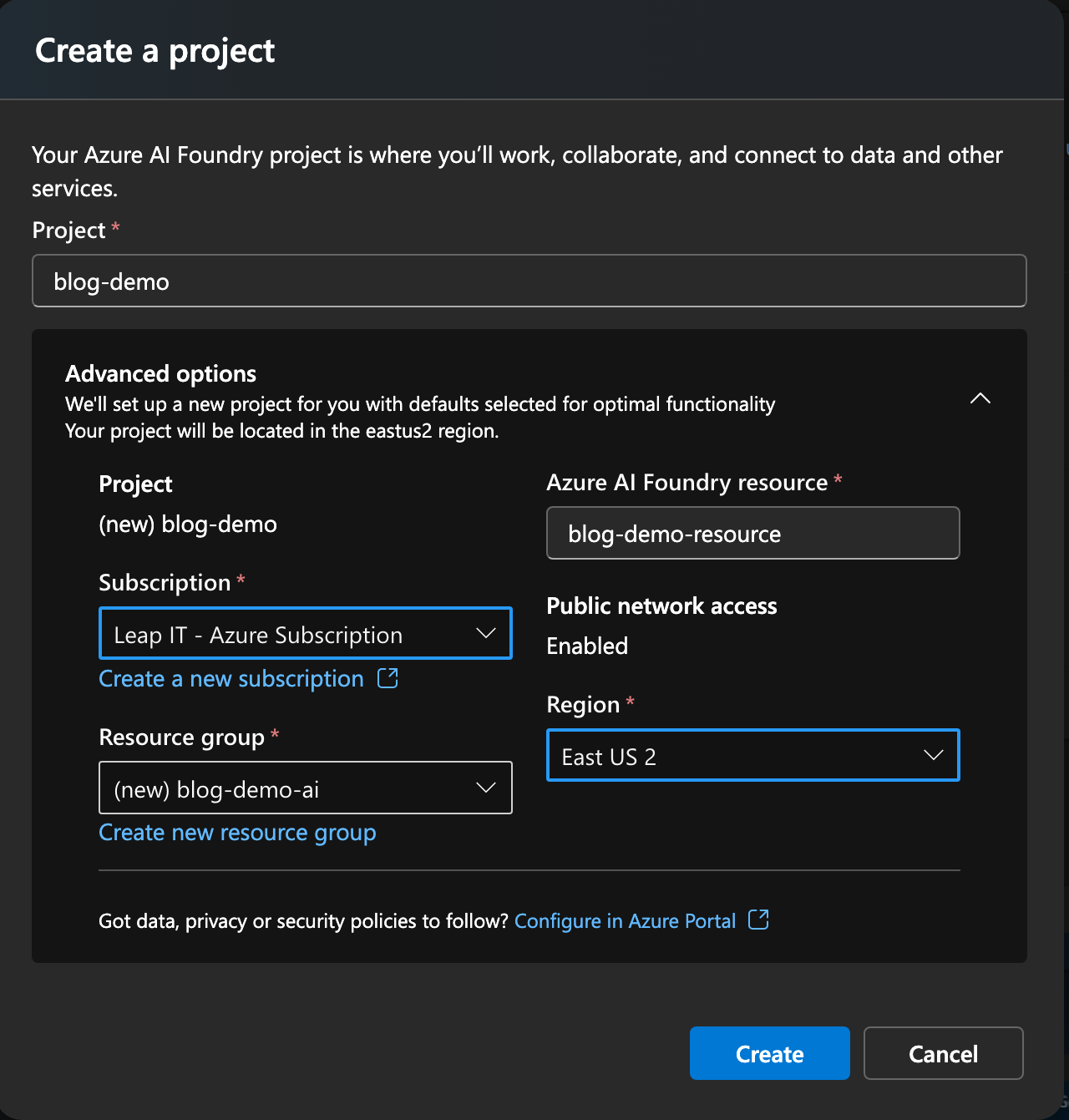 You can access the Foundry portal from ai.azure.com and follow the Getting Started steps. In short, you’ll want to create a new project, ideally in East US 2 as your region - each region has limited access to models, but East US 2 has a good overall selection. Depending on the models you want to use, you may need to choose a different region but you can easily do that when the time comes. Review the pricing pages to filter on specific regions and see what’s available.