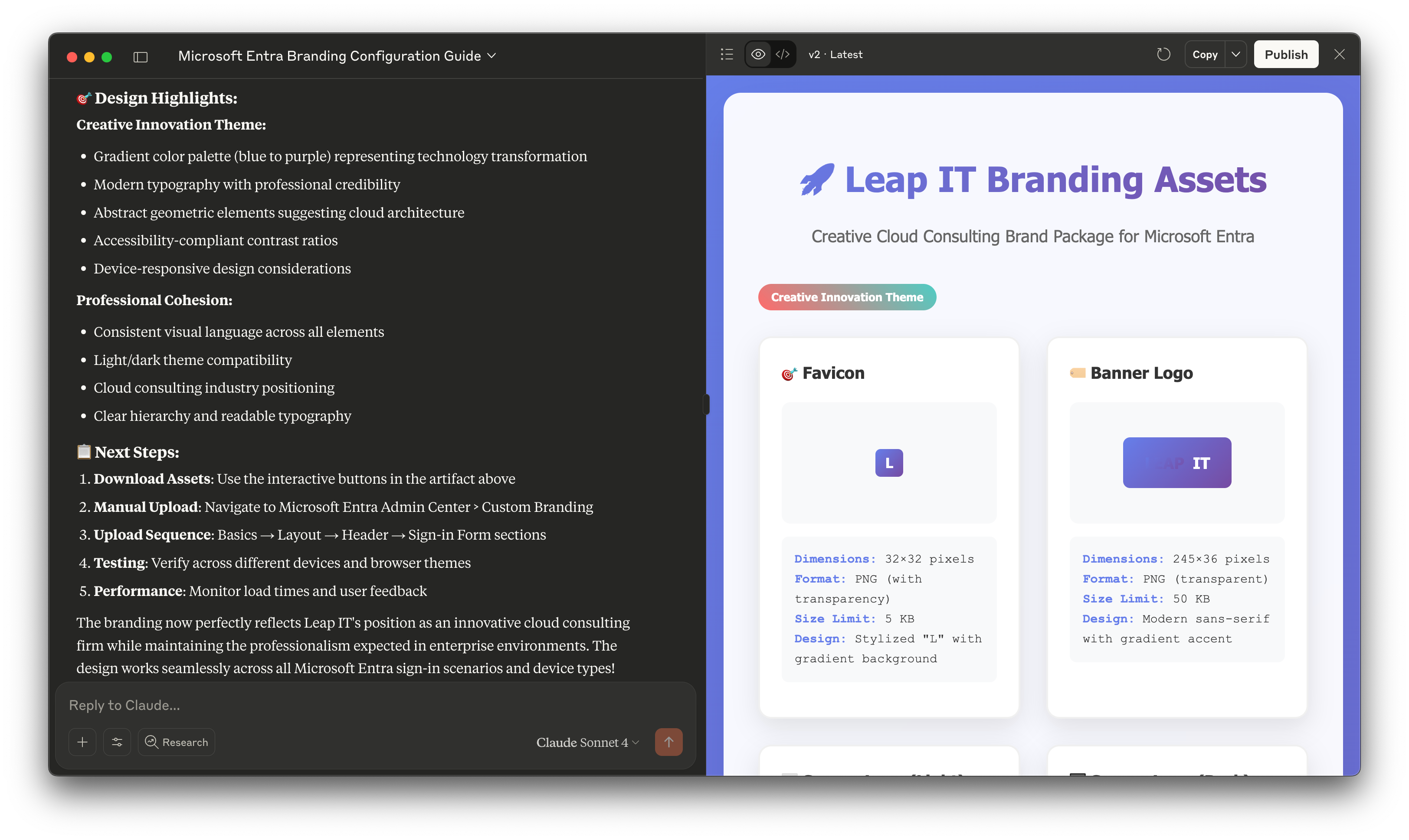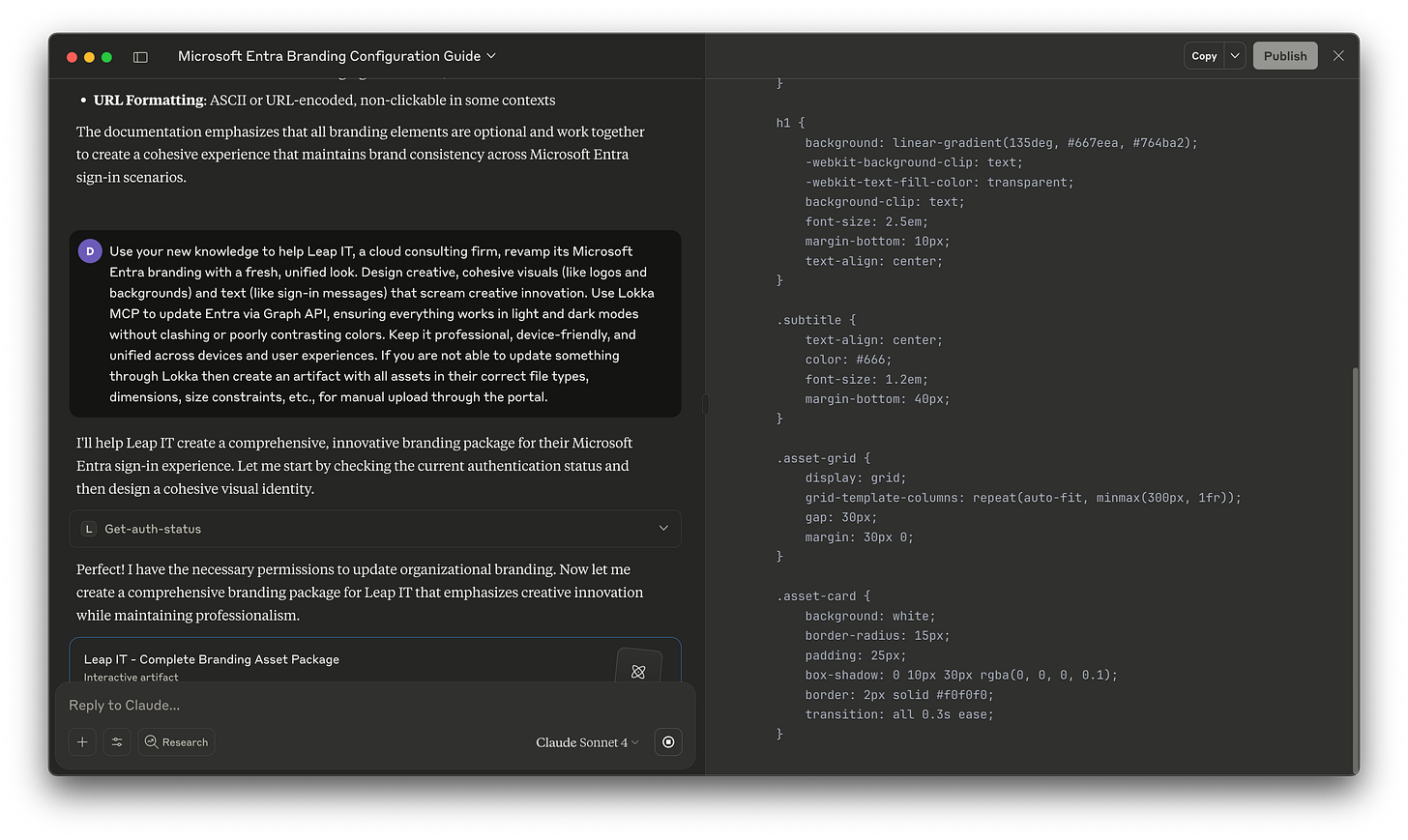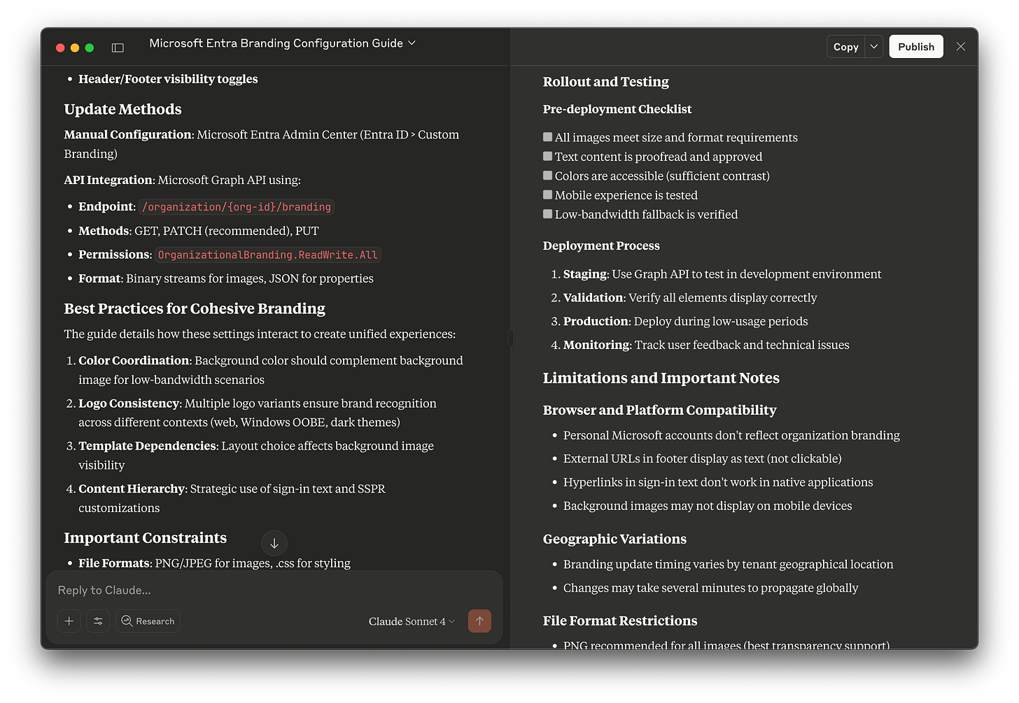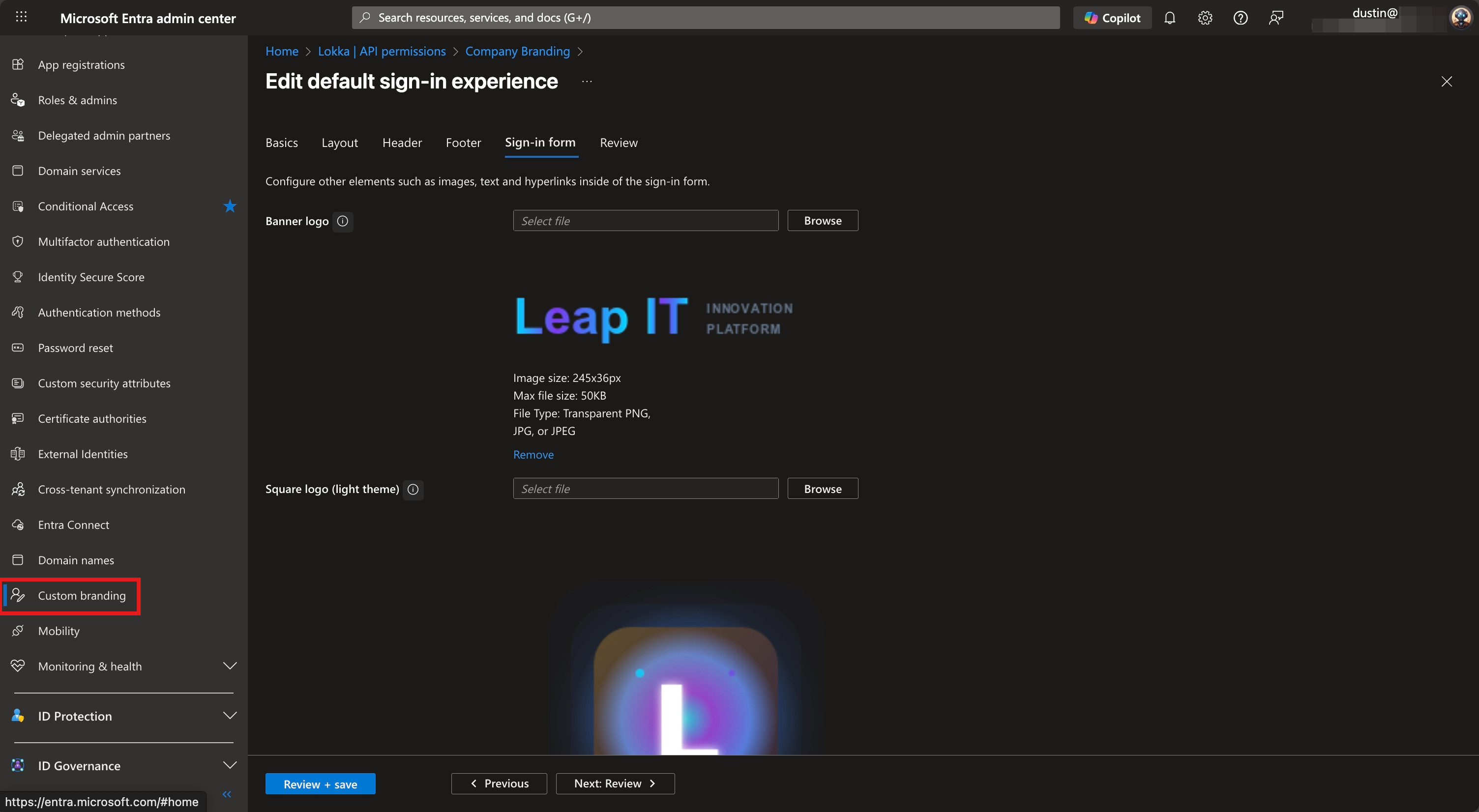 If that doesn’t work, you can finalize changes in the Entra portal. Navigate to Entra ID > Custom branding. From here you can edit and navigate through the various sub menus uploading the handful of logos, images, and files needed to wrap up. If they aren’t named intuitively then ask Claude to update the names for easier importing.