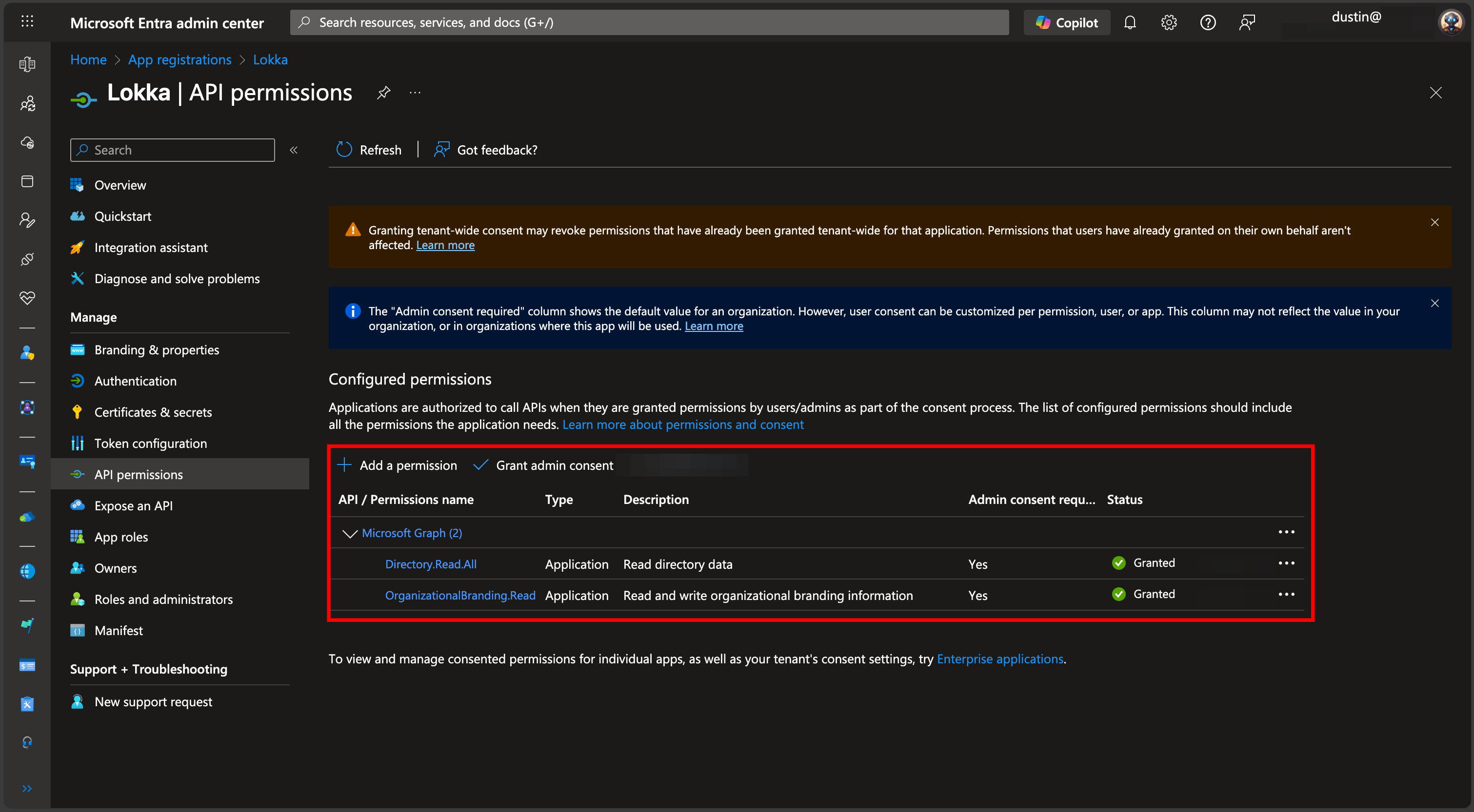 As Claude will likely mention, in order to allow Lokka to update Company Branding automatically you’ll need to add the following application permission to your Lokka App Registration: